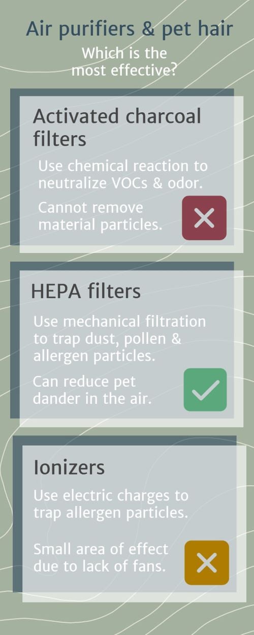 Ionized air purifiers use electric charges to trap allergen particles in the air. Similarly to HEPA, this type of purifier will work to reduce pet dander and hair floating in the air. They work without a fan, which makes them quiet - however, this also means they can only clear a small portion of the air in a room.
